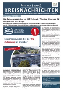 Kreisverwaltung Vulkaneifel, Mainzer Straße 25, 54550 Daun, 06592/933-0; www.vulkaneifel.de IMPRESSUM REDAKTION Verena Bernardy, Isabel Veldkamp Verlag + Druck: Linus Wittich KG, Föhren Ausgabe: 42/2025 Kfz-Zulassungsstellen im IKZ-Verbund: Wichtige Hinweise für Bürgerinnen und Bürger Erforderliche Softwareumstellung des landesweiten Kfz-Zulassungsverfahrens durch IT-Dienstleister KommWIS führt vorübergehend zu eingeschränktem Betrieb Im Rahmen der Interkommunalen Zusammenarbeit Eifel-Mosel-Hunsrück (IKZ) haben die Landkreise BernkastelWittlich, Cochem-Zell, Vulkaneifel und der Eifelkreis Bitburg-Prüm eine gemeinsame Kfz-Zulassungsstelle erfolgreich etabliert. Um geänderte gesetzliche Vorgaben umzusetzen, werden fächendeckend in Rheinland-Pfalz sukzessive alle Zulassungsstellen auf das sog. neue Fachverfahren VOIS-Kfz umgestellt. Ende Oktober betrifft dies auch die Zulassungsstellen im IKZ-Verbund. Ab Freitag, den 17.10.2025 kommt es – aufgrund der Softwareumstellung – zu Einschränkungen im Kfz-Zulassungsbetrieb. Die Zulassungsstellen im gesamten IKZ-Verbund inklusive der Außenstellen bleiben am Montag, den 20. Oktober 2025, und Dienstag, den 21. Oktober 2025, für den Publikumsverkehr geschlossen. An diesen beiden Tagen sind auch keine Kfz-Zulassungen im kompletten IKZ-Verbund, d.h. in den Landkreisen Bernkastel-Wittlich, Cochem-Zell, Vulkaneifel sowie dem Eifelkreis Bitburg-Prüm möglich. Zudem stehen – aufgrund der Systemumstellung – an diesen Tagen keine OnlineDienste für Kfz-Zulassungsvorgänge zur Verfügung. Die Außenstellen der Kfz-Zulassung bleiben - aufgrund der Systemumstellung - bis einschließlich Donnerstag, den 23. Oktober 2025 für den Publikumsverkehr geschlossen. Auch in den darauffolgenden Tagen kann es unter Umständen noch zu Einschränkungen bei der Terminvergabe oder zu längeren Wartezeiten kommen. Die Umstellung wird von der KommWIS, dem zuständigen IT-Dienstleister, durchgeführt. Die Landkreise haben keinen Einfluss auf den Zeitpunkt oder die Dauer der Arbeiten. Die jeweiligen Landkreise informieren auf ihren Internetseiten, sobald die Umstellung abgeschlossen ist, und schalten dann auch wieder nach und nach Termine frei. Es lohnt sich daher, regelmäßig einen Blick in die Terminbuchung zu werfen. Bitte denken Sie auch daran, bereits gebuchte, aber nicht mehr benötigte Termine wieder zu stornieren, damit andere Bürgerinnen und Bürgerdiese nutzen können. Alle Beteiligten arbeiten mit Hochdruck daran, die Einschränkungen für die Bürgerinnen und Bürger so gering wie möglich zu halten und den gewohnten Service mit kurzen Terminvorlaufzeiten schnellstmöglich wiederherzustellen. Die Umstellung auf VOIS-Kfz legt den Grundstein für eine moderne, effiziente und serviceorientierte Bearbeitung von Kfz-Zulassungen. Wir danken Ihnen herzlich für Ihr Verständnis und Ihre Geduld und freuen uns darauf, Ihnen danach einen noch besseren Service anbieten zu können.