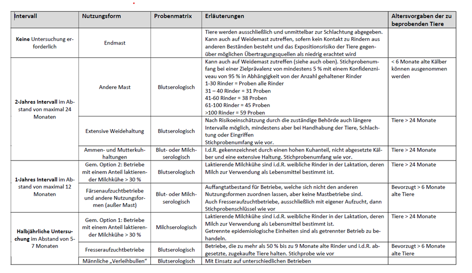 Die Überwachung wird daher ab sofort risikobasiert und unter Berücksichtigung der Betriebsart angepasst. Für die Milchviehbestände verändert sich hier vergleichsweise wenig. Für andere Haltungsformen ergeben sich sowohl Änderungen in den Untersuchungsintervallen (von alle 6 Monate bis hin zu 24 Monate) als auch beim Anteil der zu beprobenden Tieren. Dabei unterscheiden sich die Regelungen unter anderem nach Nutzungsrichtung und Altersstruktur der Tiere.