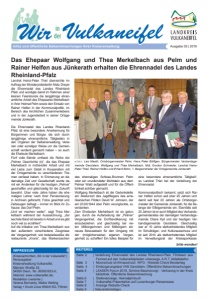 Infos und öffentliche Bekanntmachungen Ihrer Kreisverwaltung in der Wir Vulkaneifel Ausgabe 05 | 2019 (Kreisnachrichten „Wir in der Vulkaneifel“); Herausgeber: Kreisverwaltung Vulkaneifel, Mainzer Straße 25, 54550 Daun, Tel. 06592/933-0; Internet: www.vulkaneifel.de ; Redaktion (verantw.): Verena Bernardy, Meike Welling Verlag + Druck Linus Wittich KG, Föhren IMPRESSUM WEITERES Seite 2 | Verleihung Ehrennadel des Landes Rheinland-Pfalz, Filmteam aus Fernost auf den Vulkaneifelpfaden unterwegs, A.R.T. Abfalltelefon Seite 3 | Moorschutz ist Klimaschutz!, WFG - Website-Check Beratertag Seite 4 | Einbürgerungstest VHS Gerolstein, Öffentliche Bekanntmachungen Seite 5 | LEADER-Forum 2019, Schöne Bescherung! - Verlosung in der Kreis bibliothek, Öffentliche Bekanntmachung Seite 6 | Stellenanzeige, Heimatjahrbuch Seite 7 | Vulkaneifel-Präsentation auf Luxemburger Reisemesse Seite 8 | Anzeige Website-Check Seite 9 | Naturerlebnistipps Das Ehepaar Wolfgang und Thea Merkelbach aus Pelm und Rainer Helfen aus Jünkerath erhalten die Ehrennadel des Landes Rheinland-Pfalz Landrat Heinz-Peter Thiel überreichte im Auftrag der Ministerpräsidentin Malu Dreyer die Ehrennadel des Landes Rheinland- Pfalz und würdigte damit im Rahmen einer kleinen Feierstunde die langjährige ehren- amtliche Arbeit des Ehepaares Merkelbach in ihrer Heimat Pelm sowie den Einsatz von Rainer Helfen in der Kommunalpolitik, im Bereich des kirchlichen Zusammenlebens und in der Jugendarbeit in seiner Ortsge- meinde Jünkerath. Die Ehrennadel des Landes Rheinland- Pfalz ist eine besondere Anerkennung für Bürgerinnen und Bürger, die sich durch langjährige ehrenamtliche Tätigkeiten in den Organen der Selbstverwaltung, Verei- nen oder sonstiger Weise um die Gemein- schaft verdient gemacht haben – so auch die Eheleute Merkelbach. Fünf volle Bände umfasst die Reihe der „Pelmer Geschichte (n)“, die das Ehepaar Merkelbach in mühevoller Arbeit und mit viel Liebe zum Detail in Kooperation mit der Ortsgemeinde zu verschiedenen The- men verfasst haben. In Erinnerung an die damalige Zeit und Gesellschaft wurde da- mit ein Andenken für die heutigen „Pelmer“ geschaffen und gleichzeitig für die Zukunft bewahrt. Über viele Jahre haben die ehe- maligen Lehrer nach ihrer Pensionierung in Archiven geforscht, Fotos gesichtet und Zeitzeugen befragt – immer im Blick ihr Zu- hause: das Dorf Pelm. „Und wir machen weiter“, sagt Thea Mer- kelbach während der Auszeichnung, „der sechste Band ist bereits in Arbeit und es gibt noch viel zu erzählen!“ Auf die Initiative von Thea Merkelbach wur- den außerdem verschiedene Zeugnisse der Vergangenheit, wie beispielsweiße die restaurierte „Krone“, das Markenzeichen des ehemaligen Schloss-Brunnen Pelm oder ein unvollendeter Mühlstein aus dem Pelmer Wald aufgestellt und für die Öffent- lichkeit sichtbar gemacht. Wolfgang Merkelbach ist die Gedenkstelle am Absturzort des Jagdfliegers des ame- rikanischen Piloten David W. Johnson, der am 20.09.1944 über Pelm verunglückte, zu verdanken. „Den Eheleuten Merkelbach ist es gelun- gen, durch die Aufarbeitung der „Pelmer“ Vergangenheit, die Dorfbevölkerung mit einzubeziehen und gleichzeitig bei vie- len Mitbürgerinnen und Mitbürgern ein neues Bewusstsein für den Umgang mit der (möglicherweise) eigenen Vergan- genheit zu schaffen! Ein tolles Beispiel für eine besondere ehrenamtliche Tätigkeit“, so Landrat Thiel bei der Verleihung der Ehrennadel. Kommunalpoltisch bekannt, setzt sich Rai- ner Helfen schon seit über 25 Jahren und damit seit fast 20 Jahren als Ortsbürger- meister der Gemeinde Jünkerath, für die Be- lange der Eifelgemeinde ein. Ebenfalls seit 20 Jahren ist er auch Mitglied des Verbands- gemeinderates der damaligen Verbandsge- meinde Obere Kyll und der heutigen Ver- bandsgemeinde Gerolstein. Gleichzeitig war er 10 Jahre stellvertretendes Mitglied im Schulträger- und Kulturausschuss und ist seit 2014 als stellvertretendes Mitglied im Verwaltungsrat der Kreissparkasse v.l.n.r.: Leo Meeth, Ortsbürgermeister Pelm, Hans Peter Böffgen, Bürgermeister Verbandsge- meinde Gerolstein, Wolfgang und Thea Merkelbach, MdL Gordon Schnieder, Landrat Heinz- Peter Thiel, Rainer Helfen und Erhard Bohn, 1. Beigeordneter der Ortsgemeinde Jünkerath bitte wenden!