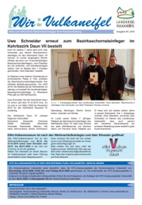 Infos und öffentliche Bekanntmachungen Ihrer Kreisverwaltung in der Wir Vulkaneifel Ausgabe 49 | 2019 Uwe Schneider erneut zum Bezirksschornsteinfeger im Kehrbezirk Daun VII bestellt Auch für weitere 7 Jahre kann sich Uwe Schneider aus Neroth Bezirksschorn- steinfeger für den Kehrbezirk Daun VII nennen. Er wurde vergangene Woche offiziell, als einer von 14 bevollmächtigen Bezirksschornsteinfegern, vom Präsiden- ten der Aufsichts- und Dienstleistungsdi- rektion Trier im Beisein des 1. Kreisbei- geordneten, Alois Manstein, bestellt. Im Rahmen einer kleinen Feierstunde im Kurfürstlichen Palais in Trier, erhielten die Bezirksschornsteinfegermeister ihre offizielle Bestellungsurkunde. Die ADD ist für die Besetzung der Kehrbezirke zu- ständig und bestellt die bevollmächtigten Bezirksschornsteinfeger. In Rheinland- Pfalz gibt es 480 Kehrbezirke. Uwe Schneider hat den Kehrbezirk Daun VII schon seit dem 01.12.2012 inne. Zu- vor war er von März 2006 bis November 2012 für den Kehrbezirk Neuwied VII zuständig. Der Kehrbezirk Daun VII umfasst folgende Ortschaften: Darscheid, Demerath, Ellscheid, Gefell, Gillenfeld, Hörscheid, Immerath, Katzwinkel, Mehren, Mü- ckeln, Sarmersbach, Saxler, Schönbach, Steineberg, Steiningen, Strohn, Strotz- büsch, Utzerath und Winkel. Im Laufe seiner bisher 7- jährigen Tätigkeit als Bezirksschornsteinfeger des Kehrbezirks Daun VII übte Uwe Schnei- der stets pflichtbewusst, mit Sachver- stand und Herzblut seine Tätigkeit aus. Er freue sich auf weitere sieben Jahre in seinem Kehrbezirk. Der 1. Kreisbeige- ordnete, Alois Manstein, wünschte Uwe Schneider im Namen des Landkreises Vulkaneifel, aber auch persön- lich, herzliche Glückwünsche zur erneuten Bestellung sowie weiterhin gute Zusammenarbeit. Die Kreisverwaltung Vulkaneifel weist daraufhin, dass die KFZ-Zulassungsstelle der Kreisverwaltung Vulkaneifel von Donnerstag, 02.01.2020 12:00 Uhr und Freitag 03.01.2020 geschlossen ist. Die Außenstelle der KFZ-Zulassungsstelle in Jünkerath ist jedoch regulär geöffnet. Aufgrund von länger anhaltenden Umbauarbeiten finden Sie die Kolleginnen und Kollegen der KFZ-Zulassungsstelle Vulkaneifel ab dem 06.01.2020 im Sitzungssaal 15a der Kreisverwaltung Vulkaneifel. KFZ-ZULASSUNGSSTELLE DER KREISVERWALTUNG VULKANEIFEL GESCHLOSSEN Eifel-Vulkanmuseum ist nach den Weihnachtsfeiertagen und über Silvester geöffnet! Das Eifel-Vulkanmuseum hat an den Weihnachtsfeiertagen vom 26.12. bis 31.12.2019 sowie nach Silvester vom 02.01. bis 06.01.2020 in der Zeit von 13.00 bis 16.30 Uhr geöffnet. Haben Sie Interesse an einem Besuch im Vulkanmuseum oder einer Führung einschließlich einer Maarexkursion? Dann schauen Sie doch bei uns vorbei! Auch in der Winterpause bieten wir Ihnen gerne Besichtigungen an. Bitte melden Sie sich dazu unter der Telefonnummer: 06592/933-290 oder per Mail unter vulkanmuseum@vulkaneifel.de . Das Team des Vulkanmuseums freut sich auf Ihren Besuch! v.l.n.r: 1. Kreisbeigeordneter des Landkreises Vulkaneifel, Alois Manstein, Bezirksschorn- steinfeger Uwe Schneider und ADD-Präsident Thomas Linnertz (Kreisnachrichten „Wir in der Vulkaneifel“); Herausgeber: Kreisverwaltung Vulkaneifel, Mainzer Straße 25, 54550 Daun, Tel. 06592/933-0; Internet: www.vulkaneifel.de ; Redaktion (verantw.): Verena Bernardy, Meike Welling Verlag + Druck Linus Wittich KG, Föhren IMPRESSUM