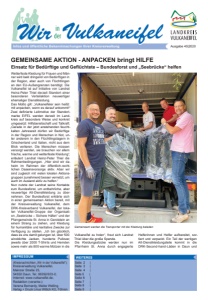 Infos und öffentliche Bekanntmachungen Ihrer Kreisverwaltung in der Wir Vulkaneifel Ausgabe 40|2020 (Kreisnachrichten „Wir in der Vulkaneifel“); Kreisverwaltung Vulkaneifel, Mainzer Straße 25, 54550 Daun, Tel. 06592/933-0; Internet: www.vulkaneifel.de ; Redaktion (verantw.): Verena Bernardy, Meike Welling Verlag + Druck Linus Wittich KG, Föhren IMPRESSUM WEITERES Seite 2 | Seite 3 | Seite 4 | Seite 5 | Seite 6 | Seite 7 | Seite 8 | Seite 9 | GEMEINSAME AKTION - ANPACKEN bringt HILFE Einsatz für Bedürftige und Geflüchtete – Bundesforst und „Seebrücke“ helfen Wetterfeste Kleidung für Frauen und Män- ner wird bald dringend von Bedürftigen in der Region, aber auch von Flüchtlingen an den EU-Außengrenzen benötigt. Die Vulkaneifel ist auf Initiative von Landrat Heinz-Peter Thiel derzeit Standort einer besonderen Verteilaktion neuwertiger ehemaliger Dienstkleidung. Das Motto gilt: „Vulkaneifeler sein heißt: mit anpacken, wenn es darauf ankommt!“ Zwei definierte Leitmotive der Standort - marke EIFEL werden derzeit im Land- kreis auf besondere Weise und konkret umgesetzt: Hilfsbereitschaft und Tatkraft. „Gerade in der jetzt anstehenden feucht- kalten Jahreszeit dürfen wir Bedürftige in der Region und Menschen in Not, un- ter anderem in den Flüchtlingslagern in Griechenland und Italien, nicht aus dem Blick verlieren. Die Menschen müssen versorgt werden, sie brauchen vor allem frische, warme und wetterfeste Kleidung“, erläutert Landrat Heinz-Peter Thiel die Rahmenbedingungen. „Hier sind wir da- heim im Rahmen der öffentlich-recht- lichen Daseinsvorsorge aktiv. Aber wir sind zugleich mit vielen lokalen Aktions- gruppen zunehmend besser vernetzt, um auch im Ausland aktiv zu helfen.“ Nun nutzte der Landrat seine Kontakte zum Bundesforst, um entbehrliche, aber neuwertige Alt-Dienstkleidung zu über- nehmen. Der Bundesforst erklärte sich in einer gemeinsamen Aktion bereit, mit der Kreisverwaltung Vulkaneifel, dem DRK-Kreisverband Vulkaneifel, der loka- len Vulkaneifel-Gruppe der Organisati- on „Seebrücke – Sichere Häfen“ und der Pfarrgemeinde St. Anna in Gerolstein an einem Strang zu ziehen, und Kleidung für humanitäre und karitative Zwecke zur Verfügung zu stellen. „Ich bin glücklich, dass es uns damit gelungen ist, über 500 winddichte Jacken, hunderte Pullover, jeweils über 2000 T-Shirts und Hemden sowie mehr als 800 warme Mützen in die Vulkaneifel zu holen“, freut sich Landrat Thiel über die große Spende. Die Kleidungsstücke werden nun im Pfarrheim St. Anna durch engagierte Helferinnen und Helfer aufbereitet, sor- tiert und verpackt. Ein Teil der wertigen Alt-Dienstkleidungsteile kommt in die DRK-Second-hand-Läden in Daun und Gemeinsam werden die Transporter mit der Kleidung beladen