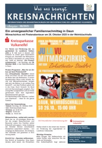 SEITE 2 der gesamten Veranstaltung bei den Erziehungsberechtigten. Die Veranstaltung wird durch die großzügige Unterstützung der Kreissparkasse Vulkaneifel ermöglicht. Kommen Sie vorbei und erleben Sie einen unvergesslichen Zirkusnachmittag – diesmal in Daun! Der Verein zur Förderung der Jugendarbeit im Landkreis Vulkaneifel freut sich auf Ihren Besuch. Hintergrund: Verein zur Förderung der Jugendarbeit im Landkreis Vulkaneifel e. V. Der Verein wurde 1961 gegründet und setzt sich für die Förderung der Jugendarbeit im gesamten Landkreis Vulkaneifel ein. Finanziert durch Mitgliedsbeiträge und Spenden unterstützt der Verein Projekte und Anschaffungen, die direkt Jugendlichen zugutekommen – etwa Jugendräume, Bolzplätze, Sport- oder Musikvereine, Seminare oder Ferienfreizeiten. Gefördert werden vielfältige Bereiche der Jugendarbeit – von Bildung, Kultur, Sport und Geselligkeit bis hin zu interkulturellen Projekten und Jugendberatung. Wichtig ist dem Verein eine gerechte Verteilung der Mittel in allen Verbandsgemeinden sowie der persönliche Kontakt zu Vereinen, Verbänden und Jugendgruppen. Der Vorstand besteht aus neun Mitgliedern, die die Zusammenarbeit mit den Verbandsgemeinden sicherstellen. Vorsitzende ist Landrätin Julia Gieseking. Kontakt: Ute Rölen, Tel. 06592 933 331 E-Mail: julavu@vulkaneifel.de Weitere Infos: www.julavu.de Nachbericht zur Zirkuswoche in Birresborn 2025 Kleine Akrobaten, große Show – Birresborn im Zirkusfieber Eine Woche voller Staunen, Lachen und leuchtender Kinderaugen liegt hinter uns. Vom 11. bis 16. August wurde Birresborn zur Zirkusmanege: Rund 100 Kinder verwandelten sich unter der Anleitung des pädagogischen Circus ZappZarap in Akrobaten, Clowns, Zauberer und Jongleure. Mit viel Freude, Mut und Kreativität probten sie ihre eigenen Kunststücke und zeigten bei den beiden Abschlussgalas stolz, was in ihnen steckt. Doch im Mittelpunkt stand nicht allein die große Show, sondern das gemeinsame Erleben, Wachsen und Miteinander – unabhängig von Herkunft, Voraussetzungen oder Fähigkeiten. Ein solches Projekt lebt vom Zusammenhalt – und genau der war in Birresborn besonders spürbar. Zahlreiche ehrenamtliche Helferinnen und Helfer aus dem Ort und der Umgebung engagierten sich mit Zeit, Kraft und Herzblut für das Gelingen der Zirkuswoche. Als Initiatorin und treibende Kraft gilt insbesondere Nina Wuttgen, Schulsozialarbeiterin an den Grundschulen Birresborn und Gerolstein (GRS+). Mit ihrer tiefen Verbundenheit zum Ort und ihrem Engagement gelang es ihr, nicht nur die Kinder mitzureißen, sondern auch viele Freiwillige zu mobilisieren und organisatorisch zusammenzubringen. Ein besonderer Dank geht an die herausragenden Ehrenamtlichen Uwe Stahl, Sophie Wuttgen und Maximilian Frank, die mit ihrem Einsatz von fast 70 Stunden maßgeblich zum Erfolg der Zirkuswoche beitrugen. Ihr unermüdliches Engagement in Betreuung, Organisation und Unterstützung war unverzichtbar. Auch der Bürgermeisterin Christiane Stahl gilt unser herzlicher Dank, die das Projekt mit großem Wohlwollen unterstützte und den Zirkus mit offenen Armen im Ort willkommen hieß – ein wichtiges Zeichen für gelebte Kinder- und Jugendarbeit in der Gemeinde. Starkes Netzwerk – starke Wirkung Gemeinsam umgesetzt wurde die Zirkuswoche als Ferienaktion vom Kreisjugendpfleger Hendrik Müller des Landkreises Vulkaneifel und der Schulsozialarbeiterin Nina Wuttgen (Grundschulen Birresborn und Gerolstein), in enger Zusammenarbeit mit dem Deutschen Roten Kreuz – Kreisverband Vulkaneifel e.V. sowie weiteren Partnern: •Marion Michels, Jugendpflege im Gerolsteiner Land •Katharina Irsfeld, Schulsozialarbeit des St.-Matthias-Gymnasiums Gerolstein (Palais e.V.) Ein großer Dank gilt außerdem der Freiwilligen Feuerwehr Birresborn, dem Förderverein Betreuende Grundschule Birresborn e. V., der Bäckerei Blasius, Edeka Thömmes in Gerolstein sowie der Nürburg Quelle Hermann Kreuter GmbH – für ihre großzügige Unterstützung und tatkräftige Hilfe. Ein Erlebnis, das bleibt Die Zirkuswoche in Birresborn war mehr als ein Ferienprogramm: Sie war ein Ausdruck eines starken Miteinanders und einer Dorfgemeinschaft, die zusammen Großes auf die Beine gestellt hat. Und für die Kinder? Eine unvergessliche Woche voller Mut, Magie und Gemeinschaft.