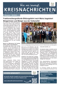 Kreisverwaltung Vulkaneifel, Mainzer Straße 25, 54550 Daun, 06592/933-0; www.vulkaneifel.de IMPRESSUM REDAKTION Verena Bernardy, Isabel Veldkamp Verlag + Druck: Linus Wittich KG, Föhren Ausgabe: 39/2025 Fraktionsübergreifende Bildungsfahrt nach Mainz begeistert Bürgerinnen und Bürger aus der Vulkaneifel Die Kommunale Gleichstellungsbeauftragte Doris Sicken hatte gemeinsam mit Landrätin Julia Gieseking zu einem fraktionsübergreifenden Besuch der drei Landtagsabgeordneten aus dem Landkreis Vulkaneifel, Jens Jenssen, Gordon Schnieder und Marco Weber in den rheinland-pfälzischen Landtag sowie das benachbarte Ministerium für Familie, Frauen, Kultur und Integration (MFFKI) nach Mainz eingeladen. 50 Bürgerinnen und Bürger aus dem Landkreis Vulkaneifel waren der Einladung gefolgt und erlebten eine spannende Bildungsreise, die viele interessante Einblicke in die Arbeit des Ministeriums und des Landtags ermöglichte. Besuch im Ministerium für Familie, Frauen, Kultur und Integration Der Auftakt des Tages in der Landeshauptstadt führte die Gruppe ins Ministerium, wo die Teilnehmenden die einmalige Möglichkeit zu einem informellen, persönlichen Austausch mit Staatsministerin Katharina Binz hatten. Im Mittelpunkt standen frauen- und gleichstellungsrelevante Themen, wie die Umsetzung des neuen Gewalthilfegesetzes, das betroffenen Frauen einen Rechtsanspruch auf Schutz und Beratung zusichert. Neben steigenden Zahlen häuslicher Gewalt kamen auch Fragen zur Gleichberechtigung in Care-Arbeit und bei Lohnzahlungen, Bekämpfung von Hetze im Netz, wie die Präventionskampagne „Scroll nicht weg“ oder Phänomene wie „Catcalling“, sexuell aufgeladene Bemerkungen oder Gesten im öffentlichen Raum, zur Sprache. Ziel sei es, so die Ministerin, dass alle Menschen frei von Gewalt und ohne Diskriminierung im privaten wie im öffentlichen Raum leben können, es keine Lohnunterschiede zwischen Männern und Frauen mehr gibt und die Care-Arbeit gleichberechtigt aufgeteilt wird – erst dann sei echte Gleichstellung erreicht. Einblicke in die Arbeit des Landtags Nach einem gemeinsamen Mittagessen im Landtagsrestaurant „Esszimmer“, bot sich den Teilnehmenden die einmalige Gelegenheit zu einem fraktionsübergreifenden Gespräch mit den Abgeordneten Jenssen, Schnieder und Weber. Die Abgeordneten aus der Vulkaneifel teilten ihre Erfahrungen aus der Landespolitik, beantworteten zahlreiche Fragen der Gäste und gingen auf viele regionale Themen, die auch den Landkreis Vulkaneifel betreffen, ein. Zur Sprache kamen im Hinblick auf die anstehende Landtagswahl im nächsten Jahr, eine paritätische Besetzung in den Fraktionen, Schul- und Bildungspolitik mit Schwerpunkt auf frühkindlicher Bildung, Verbesserungen im ÖPNV, die Schließung von Geburtsstationen trotz hoher Geburtenzahlen im Landkreis, der Lückenschluss der A1 und viele weitere Anliegen der Vulkaneifel. Trotz unterschiedlicher Parteizugehörigkeit betonten die drei Abgeordneten, dass sie sich gemeinsam und fraktionsübergreifend für die Belange ihrer Heimatregion einsetzen. Im Anschluss erhielten die Besucherinnen und Besucher Kenntnisse in die Die drei Landtagsabgeordneten gemeinsam mit den 50 Teilnehmenden der Bildungsfahrt.