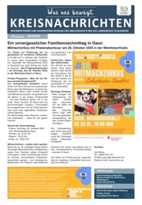 SEITE 2 Vernetzung für mehr Teilhabe: Fachkräfte treffen sich in Gerolstein Am 18. September 2025 trafen sich in Gerolstein die Fachkräfte des Landesprogramms Gemeindeschwesterplus und die Pflegestützpunkte des Landkreises Vulkaneifel mit dem Beraterteam Seymour Steffes und Tamara Ley von der Ergänzenden unabhängigen Teilhabeberatung (EUTB). Im Mittelpunkt stand die Frage, wie Beratungsangebote in der Region künftig noch enger zusammenarbeiten können, um Ratsuchenden bestmögliche Unterstützung zu bieten. Die beiden Berater aus Daun und Bitburg stellten das umfassende Angebot der EUTB vor. Diese wurde im Zuge des Bundesteilhabegesetzes (BTHG) eingerichtet, wird durch das Bundesministerium für Arbeit und Soziales gefördert und ergänzt die bestehenden Beratungsstrukturen. Ziel ist es, die Selbstbestimmung von Menschen mit Behinderungen und von Menschen, die von Behinderung bedroht sind, zu stärken. Auch Angehörige können das Angebot kostenfrei nutzen. Besonders betont wurde die unabhängige, barrierefreie und individuelle Beratung: von Fragen rund um Schwerbehindertenausweise über Leistungen zur Teilhabe bis hin zu Unterstützungsmöglichkeiten im sozialen und beruflichen Leben. Als neutrale erste Anlaufstelle ersetzt die EUTB keine Rechtsberatung, stärkt aber Ratsuchende und begleitet sie bei wichtigen Entscheidungen. Mit dem Treffen in Gerolstein wurde ein wichtiger Schritt getan, um die Beratungs- und Unterstützungsangebote im Landkreis Vulkaneifel stärker zu vernetzen – und damit Teilhabe und Inklusion vor Ort weiter voranzubringen. Kontakt: EUTB – Ergänzende unabhängige Teilhabeberatung Vulkaneifel Seymour Steffes Tel.: 06592 999350 s.steffes@eutb-rlp.de V.l.n.r.: Elisabeth Reinarz (Landesprogramm Gemeindeschwesterplus), Seymour Steffes (EUTB LK Vulkaneifel), Yvonne Surges (Landesprogramm Gemeindeschwesterplus), Renate Steffens (Pflegestützpunkt Daun-Kelberg), Tamara Ley (EUTB Eifelkreis Bitburg-Prüm), Steffi Hain (Pflegestützpunkt Gerolstein), Melina Mauren (Pflegestützpunkt Daun-Kelberg) Verabschiedung bei der Kreisverwaltung Vulkaneifel - Suanne Koller geht in den wohlverdienten Ruhestand Nach 17 Jahren im Dienst der Kreisverwaltung Vulkaneifel wurde Susanne Koller am 25. September 2025 in den wohlverdienten Ruhestand verabschiedet. Susanne Koller startete ihre berufliche Laufbahn mit einer Ausbildung zur Verwaltungsfachangestellten, die sie von August 1980 bis Juli 1983 bei der Verbandsgemeindeverwaltung Gerolstein absolvierte. Nach einem Wechsel in die Bundeswehrverwaltung entschied sie sich im Jahr 2004, ihre fachlichen Kompetenzen weiter auszubauen und nahm am Vorbereitungslehrgang zur Angestelltenprüfung II an der Bundeswehrverwaltungsschule IV in Oberammergau teil. Diesen schloss sie noch im selben Jahr erfolgreich mit der Prüfung ab. Nach ihrer Tätigkeit als Bezirksverwalterin in der Eifelkaserne Gerolstein beim Bundeswehr-Dienstleistungszentrum Mayen (ehemals Standortverwaltung Gerolstein) wechselte Susanne Koller im August 2008 in das Sozialamt bei der Kreisverwaltung Vulkaneifel. Dort war sie seither als Sachbearbeiterin im Bereich „Hilfe zur Pflege“ tätig. „Susanne Koller zeichnete sich durch eine hohe fachliche Kompetenz aus und war im Umgang mit den Bürgerinnen und Bürgern ein Vorbild" betont Abteilungsleiter Dietmar Engeln. Im Rahmen einer kleinen Feierstunde dankte Landrätin Julia Gieseking Susanne Koller im Namen der gesamten Kreisverwaltung herzlich für ihren jahrelangen Einsatz und wünschte ihr für den neuen Lebensabschnitt alles Gute, Gesundheit und viele schöne Momente mit ihrer Familie. Abschied in den wohlverdienten Ruhestand: v. l. n. r.: Dietmar Engeln (Abteilungsleiter), Waltraud Zender (Vorstand Personalrat), Susanne Koller, Julia Gieseking (Landrätin), Dieter Schmitz (Büroleiter), Foto: Kreisverwaltung Vulkaneifel