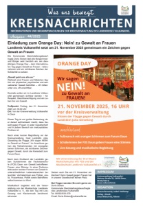 Kreisverwaltung Vulkaneifel, Mainzer Straße 25, 54550 Daun, 06592/933-0; www.vulkaneifel.de IMPRESSUM REDAKTION Verena Bernardy, Isabel Veldkamp Verlag + Druck: Linus Wittich KG, Föhren Ausgabe: 44/2025 Einladung zum Orange Day: Nein! zu Gewalt an Frauen Landkreis Vulkaneifel setzt am 21. November 2025 gemeinsam ein Zeichen gegen Gewalt an Frauen Die Kommunale Gleichstellungsbeauftragte Doris Sicken lädt alle Bürgerinnen und Bürger sehr herzlich ein, am diesjährigen Orange Day – dem Internationalen Tag gegen Gewalt an Frauen – teilzunehmen und ein sichtbares Zeichen der Solidarität zu setzen. „Gewalt geht uns alle an." Weltweit sind Frauen und Mädchen täglich von physischer, psychischer und sexualisierter Gewalt betroffen – oft mitten unter uns, oft unsichtbar. Deshalb wollen wir im Landkreis Vulkaneifel gemeinsam sichtbar werden – für Respekt, Gleichberechtigung und ein Leben frei von Gewalt. Treffpunkt: Freitag, den 21. November 2025 um 16.00 Uhr Ort: Vor der Kreisverwaltung Vulkaneifel in Daun Dieser Tag ist von großer Bedeutung, da er darauf aufmerksam macht, dass Gewalt gegen Frauen in jeder Gesellschaft und in jedem Bereich ein inakzeptables Problem ist. Nach einer kurzen Begrüßung vor der Kreisverwaltung, hisst Landrätin Julia Gieseking die Flagge „Wir sagen NEIN! zu Gewalt an Frauen“. Im Anschluss gehen die Teilnehmenden mit orangefarbenen Schirmen, als sichtbares Zeichen gegen Gewalt, durch die Kreisstadt zum Forum Daun. Nach dem Grußwort der Landrätin geben Schülerinnen der Fachoberschule (FOS) Daun von Gewalt betroffenen Frauen eine Stimme: In einer Podiumsdiskussion werden Formen von Gewalt in unterschiedlichen Lebensbereichen beleuchtet. Vertreterinnen aus Polizei, Justiz, Frauenhaus, Politik sowie Betroffene selbst kommen zu Wort. Musikalisch begleitet wird die Veranstaltung von der Musikschule Landkreis Vulkaneifel e. V., die den Tag mit LiveGesang und Klaviermusik berührend abrundet. Setzen auch Sie am 21. November ein Zeichen! Denn Gewalt gegen Frauen hat in unserer Gesellschaft keinen Platz. Bei Fragen wenden Sie sich gerne an: Doris Sicken Kommunale Gleichstellungsbeauftragte des Landkreises Vulkaneifel Tel. 06592/933-579 Email: Doris.Sicken@vulkaneifel.de 21. NOVEMBER 2025, 16 UHR ORANGE DAY vor der Kreisverwaltung Hissen der Flagge gegen Gewalt durch Landrätin Julia Gieseking Fußmarsch mit orangen Schirmen zum Forum Daun Schülerinnen der FOS Daun geben Frauen eine Stimme Live-Gesang und musikalische Begleitung anschließend: zu Gewalt an FRAUEN! NEIN! Mit Unterstützung der Drei-MaareRealschule plus mit FOS und der Musikschule Landkreis Vulkaneifel e.V. Wir sagen
